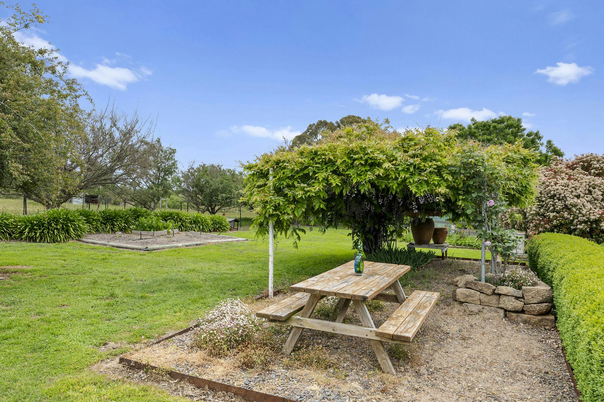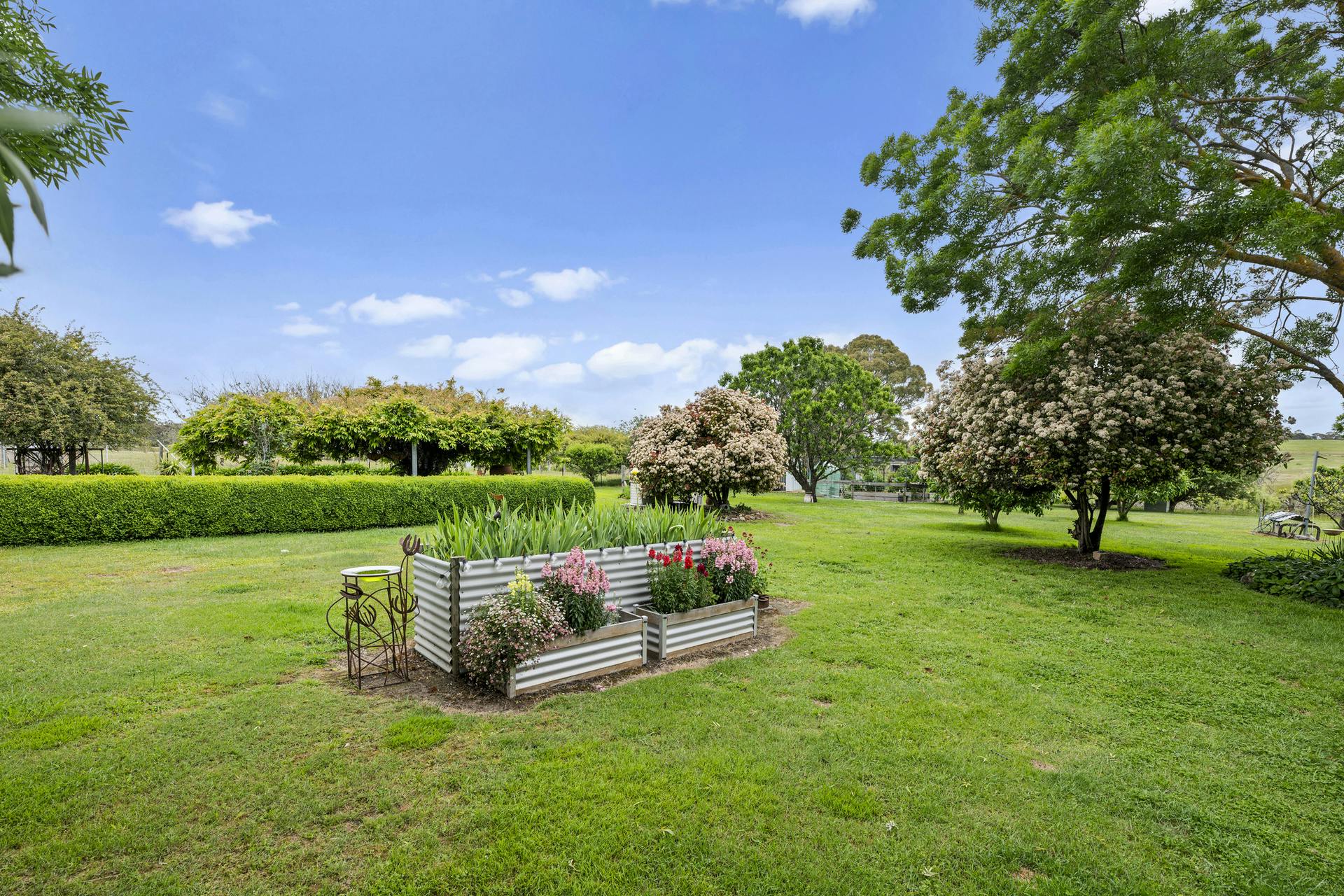 • Established gardens, fruit trees, veggie beds, broad lawn areas